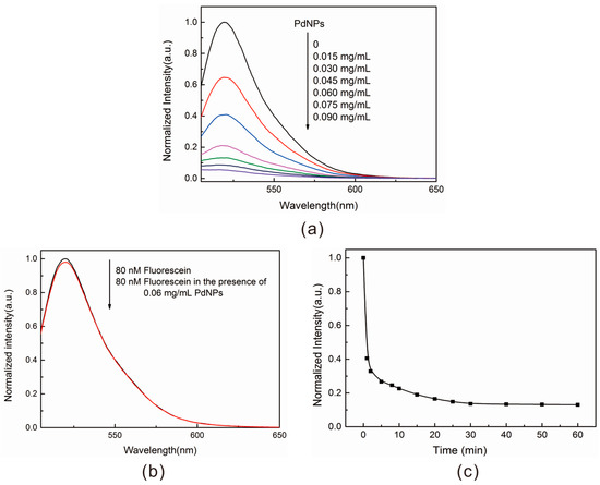 (a) Fluorescence quenching of 5′-FAM-labeled AFM1 aptamer after incubated with different concentrations of 33 nm PdNPs (0, 0.015 mg/mL, 0.030 mg/mL, 0.045 mg/mL, 0.060 mg/mL, 0.075 mg/mL, 0.090 mg/mL). (b) Fluorescence quenching of fluorescein in the presence of 0.060 mg/mL PdNPs (33 nm). (c) Time dependence of the fluorescence quenching degree for 80 nM 5′-FAM-labeled AFM1 aptamer caused by 0.060 mg/mL PdNPs (33 nm). All experiments were performed in HEPES buffer under excitation at 480 nm and emission at 520 nm.
