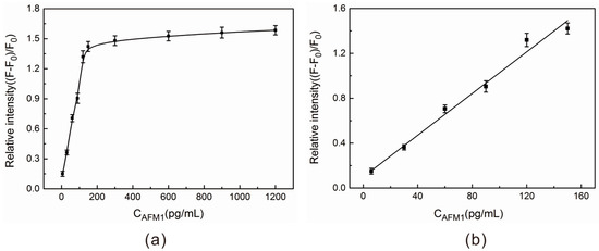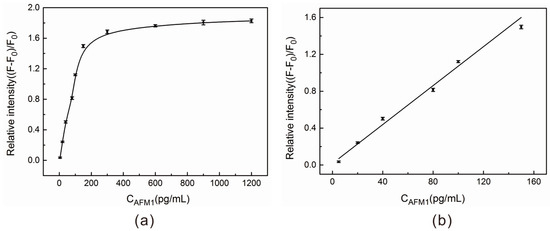 In order to ensure consumption safety and human health, it is very important to monitor the concentration of AFM1 in milk. In this paper, AFM1 detection was also realized in 100-fold diluted milk sample with HEPES buffer under the same experimental procedures as that in the aqueous buffer solution. It can be seen from Figure 5a that the fluorescence of FAM was restored in a AFM1 concentration-dependent manner. And the degree of fluorescence restoration was linear related to the concentration of AFM1 in the range from 6 pg/mL to 150 pg/mL, with a detection limit of 1.8 pg/mL (calculated as the concentration corresponding to three times of the standard deviation of the background signal from seven independent measurements) (Figure 5b). The relatively narrower linear range and higher detection limit may be ascribed to the complexity of the milk sample. Standard addition experiments were conducted to examine the feasibility of this AFM1 biosensor in practical AFM1-free milk samples. The satisfactory recoveries from 92% to 106.5% in Table 1 convincingly demonstrates that this FRET biosensor based on the efficient fluorescence resonance energy transfer between FAM and PdNPs has great potential in practical application.