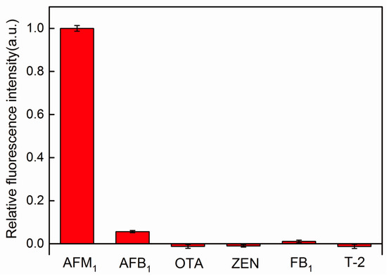 As illustrated in Scheme 1, after AFM1 was introduced into the 5′-FAM-AFM1 aptamer-PdNPs FRET system in the HEPES buffer, the AFM1 aptamer preferentially bound to AFM1 accompanied by its conformational change, which greatly weakened the coordination effect between the AFM1 aptamer and PdNPs. Therefore, FAM was separated from PdNPs and the FRET process was inhibited. Meanwhile, the fluorescence of FAM was restored and the degree of fluorescence recovery was in an AFM1 concentration-dependent manner, as indicated in Figure 3a. A linear relationship between the fluorescence recovery of FAM and the concentration of AFM1 in the range from 5 pg/mL to 150 pg/mL was obtained in the HEPES buffer, with the detection limit of 1.5 pg/mL (calculated as the concentration corresponding to three times of the standard deviation of the background signal from seven independent measurements) (Figure 3b). Compared to the previously reported structure, switching aptamer-based FRET assay for AFM1 detection with a linear detection range from 25 ng/kg to 2000 ng/kg [25], and the time-resolved fluorescent competitive immunochromatographic assay for AFM1 detection in milk with a linear dynamic range of 0.1–2.0 ng/mL [34], the sensitivity of the present sensor is significantly improved, which shows great potential to detect lower concentration of AFM1 in milk samples. The performance improvement of this FRET largely relied on the excellent fluorescence quenching ability of PdNPs towards FAM, with almost negligible non-specific fluorescence quenching. Other interfering toxins, including AFB1, OTA, ZEN, FB1 and T-2 toxin, were added individually into the FAM-AFM1 aptamer-PdNPs FRET system in the place of AFM1 under the same experimental procedures to examine the specificity of this FRET biosensor for AFM1. It can be seen from Figure 4 that the interference toxins all cause negligible fluorescence variation of FAM compared to AFM1, which firmly indicated the excellent specificity of this developed FRET biosensor towards AFM1 as a result of the high binding affinity between AFM1 aptamer and AFM1.