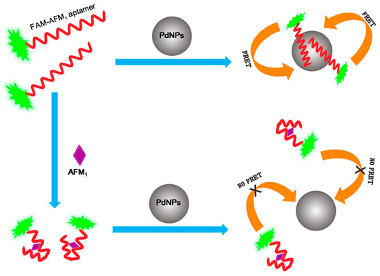 Schematic illustration of the biosensor for aflatoxin M1 (AFM1) detection based on aptamer-bridged fluorescence resonance energy transfer (FRET) from 5-carboxyfluorescein (FAM) to palladium nanoparticles (PdNPs).