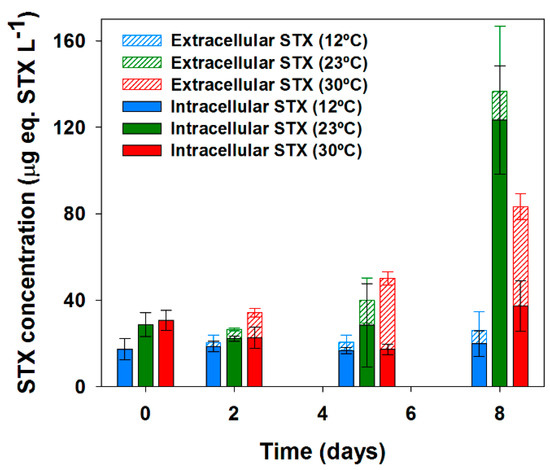 Aph. gracile UAM529 produced moderate concentrations of total STX (sum of intracellular and extracellular STX), detectable at the three temperatures varying from 17.3 to 136.5 µg equiv. STX L−1 over the entire experimental range (Figure 1). Total saxitoxin concentrations increased over time at the three temperatures (Figure 1), reaching maxima on day 8 in all cases. On day 8, the maximum concentration was detected in the cultures at 23 °C (136.5 µg equiv. STX L−1), being 64% higher than that at 30 °C (83.3 µg STX equiv. L−1) and with a minimum at 12 °C up to 5-fold lower than that measured at 23 °C.