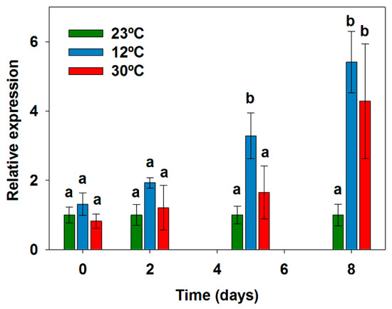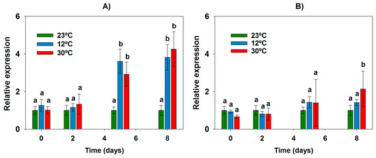 Temperature induced differences in the expression levels of sxtA, as can be observed in Figure 2. SxtA showed higher expression levels at the extremes of temperature (12 °C and 30 °C) than at the intermediate temperature of 23 °C throughout the 8-day growth period. Those differences were more evident (and statistically significant), especially on days 5 and 8 (Figure 2). Indeed, on day 8, relative expression values at the extremes of temperature were 4.3-fold (at 30 °C) and 5.4-fold (at 12 °C) higher than those at the reference temperature of 23 °C.