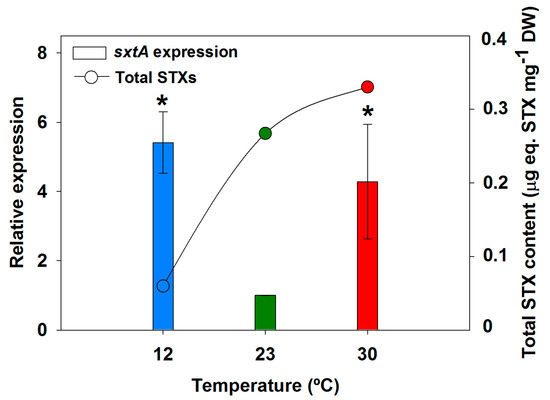Relationship between total STX content and sxtA gene expression in Aphanizomenon gracile UAM529 after 8 days of growth. Vertical bars show relative expression values respective to 23 °C, which was set to 1 to facilitate comparison. Asterisks indicate significant differences of relative expression with 23 °C (p < 0.05; one-way ANOVA and Holm-Sidak post hoc test).