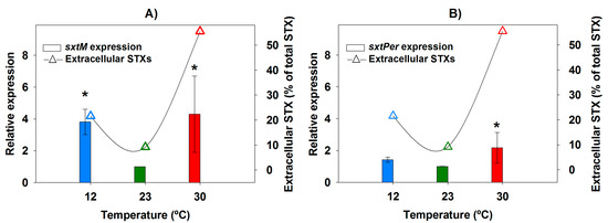 In the case of sxtM, the increased expression levels found at the extremes of temperature (12 and 30 °C) coincided with a larger extracellular STX share, especially at 30 °C (Figure 5A). Concerning sxtPer (Figure 5B), this relationship was unclear for both temperatures, and the large extracellular STX proportion at 30 °C (55.5%) coincided just with a slight overexpression of sxtPer (2.1-fold) compared to 23 °C.