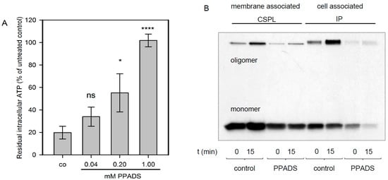 Pyridoxal phosphate-6-azophenyl-2′,4′-disulfonic acid (PPADS) protects HaCaT-cells from Hla-dependent loss of ATP and inhibits Hla oligomerisation. Panel (A): Human adult skin keratinocytes (HaCaT-cells) were treated with 6 nM Hla for 2 h in the presence or absence of PPADS (pyridoxal phosphate-6-azo(benzene-2,4-disulfonic acid) at the indicated concentrations. Subsequently cellular ATP was measured. Shown are mean ± standard deviation of n = 3 independent assays. Differences between control samples (co; i.e., HaCaT cells with Hla only) and samples receiving additionally 1 mM or 200 µM PPADS are significant as assessed by ANOVA multiple comparison and Tukey’s post-test: ns (not significant) denotes p > 0.05; * denotes p ≤ 0.05 and **** denotes p ≤ 0.0001; Panel (B): HaCaT-cells were incubated in absence (control) or presence of 1 mM PPADS for 30 min at 37 °C, followed by incubation for 40 min on ice with radioactive Hla (about 30 nM). Directly after washing (0 min) or after a subsequent incubation at 37 °C for 15 min, bound Hla was determined. Cell-associated Hla was immune-precipitated from the pellet (IP), while membrane-associated Hla was precipitated employing surface-biotinylation followed by application on a streptavidin-column (CSPL). Fluorographic analysis of the SDS-gel separated bands show the presence of two bands, the monomeric Hla at about 33 kDa, and the oligomeric form between 200 and 250 kDa. The experiment was repeated with virtually identical results. The reduced intensity of the bands in presence of PPADS indicate a reduced level of cell-associated and membrane-associated monomers and oligomers.