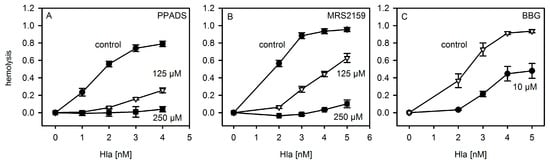 P2XR-inhibitors inhibit Hla-dependent hemolysis of rabbit erythrocytes. Rabbit erythrocytes were incubated for 60 min at 37 °C with three different inhibitors of ATP-gated purinergic receptors (P2XRs): Panel (A): PPADS (pyridoxal phosphate-6-azo(benzene-2,4-disulfonic acid), number of experiments: control: n = 5; 125 µM: n = 3, 250 µM: n = 2); Panel (B): MRS2159 (a PPADS derived inhibitor) (control: n = 4; 125 and 250 µM: n = 2 each; Panel (C): BBG (Brilliant Blue G) (inhibitor and control: n = 3 each). Controls denote the hemolysis curve in absence of inhibitor.