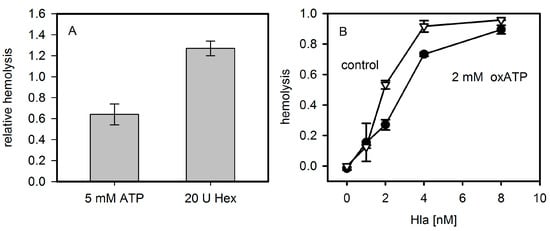 Effect of ATP and analogues on hemolysis. Panel (A): Rabbit erythrocytes were mixed with 4 nM Hla with or without extracellular ATP and hemolysis was measured after 15 min at 37 °C. The importance of extracellular bulk ATP was additionally investigated by incubation of erythrocytes in absence and presence of 20 units of hexokinase for 60 min at 37 °C. Lysis levels were normalized to the value in absence of ATP or hexokinase, respectively; Panel (B): Rabbit erythrocytes were incubated for 60 min at 37 °C in presence of 2 mM of oxidized ATP (oxATP) and various concentrations of Hla. Number of experiments: ATP and hexokinase: triplicates; oxATP (control: n = 2; oxATP: n = 4).
