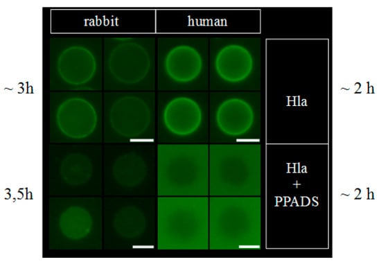 Our collective results suggest an interference of PPADS and MRS2159 with Hla binding and oligomer formation, apparently due to the competition between PPADS and membrane constituents for Hla. This nicely fits to the observation that binding of Hla to human erythrocytes—which have an overall lower affinity for Hla—is much more affected by PPADS than binding to rabbit erythrocytes, which carry binding sites of higher affinity [10]. Inhibition by BBG seems to operate by a different mechanism. The minor effect observed due to the presence of oxATP is not necessarily related to P2XR-inactivation; as it has been shown to be not a specific inhibitor of P2XRs [18,19] and the effects might be due to the inhibition of other targets.