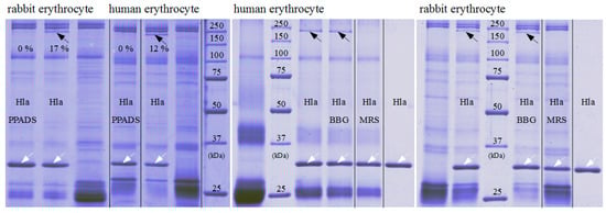The fact that our data with rabbit erythrocytes deviate in some aspects from an earlier study might in part be related to the different purity levels of the Hla-preparations used: whereas, our preparations from cultures of S. aureus contain very low amounts of contaminants (see Figure 5, last lane shows Hla without erythrocytes), Hla from a commercial source consists of merely ~60% protein (according to the manufacturer). Moreover, only part of said protein content appears to be intact Hla [17]; in the same study, it was shown that even heat-inactivated S. aureus preparations—thus, being devoid of functional Hla-amplify the response to Hla-treatment in monocytes. Some variation in modulation of hemolytic activity has also been observed for HlyA, when crude and pure preparations are compared [5].