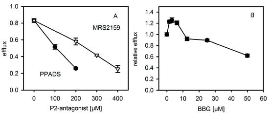 P2XR-antagonists reduce Hla-dependent efflux of calcein from liposomes. Efflux of calcein from liposomes was measured after 30 min at 37 °C. The concentration of Hla is about 250 nM; antagonist concentration is as indicated. Panel (A): PPADS (pyridoxal phosphate-6-azo benzene-2,4-disulfonic acid) and PPADS derived inhibitor MRS2159. Panel (B): BBG (Brilliant Blue G); here the efflux in presence of BBG is normalized to the value in absence of BBG. Data are triplicates each.