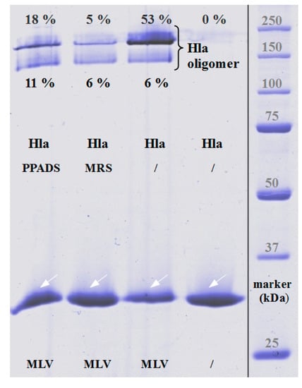 Direct influence of P2XR-inhibitors on Hla-oligomer formation on liposomes. SDS-gel electrophoresis was performed to estimate the amount of oligomerised Hla, which runs as high-molecular weight bands in absence of sample heating and reduced SDS-concentration. The white arrows indicate the position of Hla-monomers, the black bracket SDS-stable Hla-oligomers. Overall oligomer formation on multilamellar liposomes (MLVs) is reduced from 59% (without inhibitor treatment) to 29% in case of PPADS and 11% for MRS, respectively. The Hla concentration is 2.5 µM in each sample.