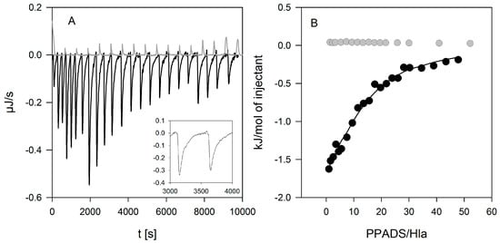Binding of PPADS to Hla detected by isothermal titration calorimetry. PPADS (5 mM) was injected into Hla (18 µM) resulting in exothermic reaction enthalpy (black lines (A) and symbols (B)), clearly differing from the slightly positive heat of dilution of PPADS (gray lines (A) and symbols (B)). The peaks were rather broad (inset in panel (A)), indicating a slow response to PPADS binding. A fit based on one binding site per Hla (solid line in panel (B)) yielded a binding constant of 2200 ± 100 M−1 and a binding enthalpy of 190 ± 1 kJ/mol.