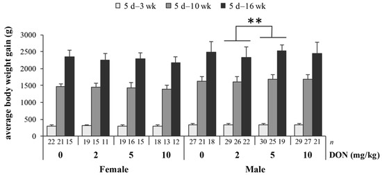 Data analysis was conducted by using the SAS statistical software package, version 9.3 (SAS Institute, Cary, NC, USA). The main effects of DON (0, 2, 5, and 10 mg/kg), sex (male and female), exposure time length (duration: 5 days–3 weeks, 5 days–10 weeks, and 5 days–16 weeks of age), and their interactions were determined by adopting the general linear model (GLM) computing procedure for ANOVA, followed by the Tukey–Kramer’s multiple comparisons test among least square means (LSMEANS) for unbalanced samples. Due to the excluded data of sacrificed birds at 3 and 10 weeks of age, statistical analysis of data from sacrificed birds at 16 weeks of age was done by using only DON and sex as the main effects. A statistical level of p < 0.05 was used as the criterion for significance, while p < 0.1 defined tendency.
