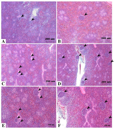 Effects of deoxynivalenol (DON) on spleen histopathology in Taiwan country chickens at 16 weeks of age. Hematoxylin-eosin staining of spleen sections in chickens fed with: (A) basal diet; (B) 2 mg DON/kg diet; (C,E) 5 mg DON/kg diet; and (D,F) 10 mg DON/kg diet. Magnification: (A–D) ×40; (E,F) ×100. Germinal centers are indicated by arrowheads.
