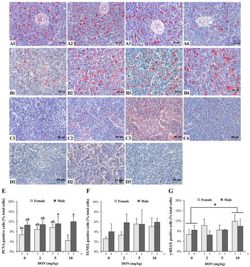 Moreover, for studying the effects of DON on a cellular and protein level, we performed immunohistochemistry (IHC) tests and terminal deoxynucleotidyl transferase dUTP nick end labeling assay (TUNEL assay) on spleen tissues to locate the proliferating, apoptotic, and DNA damaged cells in situ. Proliferating cell nuclear antigen (PCNA) is recognized as a DNA clamp to assist DNA polymerase δ during cell mitosis, and can be used to determine cell proliferation via IHC tests [37]. As for estimating apoptotic cells, TUNEL staining was often used for identifying 3′-hydroxyl ends of fragmented DNA, whose presence was known to be characteristic of cells undergoing apoptotic process [38]. γ-H2AX is considered a sensitive marker for detecting DNA damage in cells [39,40]. If a DNA double-strand break (DSB) occurred, as a part of the histone family, H2AX becomes phosphorylated (also known as γ-H2AX) and migrates adjacent to the site of injury to form a focus, which is visible by immunostaining [39].