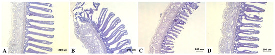 For the handling and sectioning of intestinal specimens, we referred to the method described by Ozden et al. [43] with some modifications. In brief, stored samples were blotted, trimmed, embedded within OCT compound (Tissue-Tek O.C.T. compound; Sakura Finetek, Torrance, CA, USA), and frozen in liquid nitrogen. Tissue blocks were frozen-sectioned using a cryostat microtome (Leica, Heidelberg, Germany) at 8-μm thickness and placed on glass slides. Sections were stained by hematoxylin and observed by light microscopy under ×40 magnification. Photos were taken and measured by Image-Pro AMS 6.0 software (Media Cybernetics Inc., Silver Spring, MD, USA). A total of twenty intact villi of jejunum or ilium were measured in height for an individual chicken.