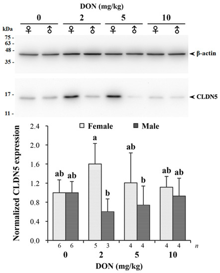 Measured relative expression of CLDN5 normalized by β-actin in jejunum is given in Figure 6. The targeting band of CLDN5 with a molecular weight around 17 kDa on Western blotting was comparable to previous studies [43]. There was a significant interaction found in DON and sexes (p = 0.043). DON reduced the expression of CLDN5 in male chickens receiving 2 and 5 mg/kg of DON, while female chickens in the same groups had relatively increased expression levels. The difference between males and females was more pronounced in the 2 mg/kg treatment.