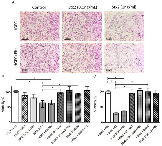 Microvasculature damage by Stx2. Human glomerular endothelial cells (HGEC) were seeded on gelatin-coated glass coverslips (A), or 24-well plates (B,C) treated or not with 0.1 ng/mL (S0.1), 1 ng/mL (S1) Stx2, 1 ng/mL Stx2 inactivated by heating (S1 inact) or 1 ng/mL Stx2B (Stx2B). After 24 h, platelets (Plts) (1 × 108/well) were added at 37 °C in 5% CO2 for 1 h and washed. (A) Representative images by light microscopy from each experimental condition stained with H&E (×10) are shown. Viability was evaluated 1 h (B) or 18 h (C) after Plts addition. Cells were incubated with neutral red an additional hour at 37 °C in 5% CO2. The percentage of viable cells was calculated considering that absorbance (A) obtained for cells incubated without toxin treatment represents 100% viability. Each condition was made in duplicate for each experiment. Data are expressed as median and interquartile range of three independent experiments (n = 3). * p < 0.05.