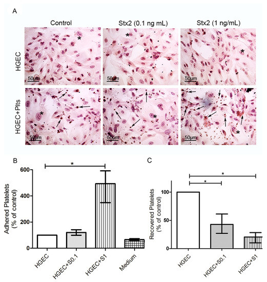 Platelet adhesion to damaged endothelium. HGEC were seeded on gelatin-coated glass coverslips (A), or 24-well plates (B,C) treated or not with 0.1 ng/mL (S0.1) or 1 ng/mL (S1) Stx2. After 24 h, Plts (1 × 108/well) were added for 1 h at 37 °C in 5% CO2 and washed. (A) Representative images by light microscopy from each experimental condition stained with H&E (×400) are shown. HGEC are indicated by asterisk and Platelets by arrows. (B) Cells were incubated with PNP and acid phosphatase activity was measured reading A at 405 nm. A obtained in wells with HGEC without platelets was subtracted from that obtained in wells with platelets for each experimental condition. The percentage of adhered platelets was calculated considering that wells without Stx2 treatment represents 100%. The control of platelet adhesion to gelatin-covered well is shown as medium. (C) Supernatants from HGEC-Plts cultures were collected and the number of Plts recovered was determined by hematology analyzer. The number of Plts recovered in HGEC cultures without Stx2 treatment represented 100%. Each condition was made in duplicate for each experiment. Data are expressed as median and interquartile range of five independent experiments (n = 5). * p < 0.05.