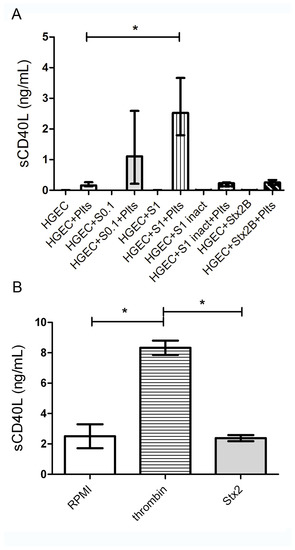 When considering that controversial results regarding Stx direct effect on platelets have been shown [36,37,38,39], we determined if Stx2 was able to directly stimulate platelets to release sCD40L. Thus, platelets were incubated with 1 ng/mL Stx2 for one hour and thrombin was used as a positive control. Then, supernatants were collected and sCD40L concentration measured by ELISA.