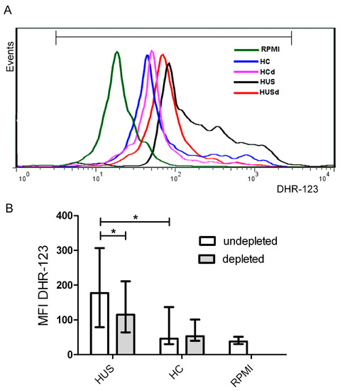 PBMC (1 × 106) were incubated 1 h with 10% of HUS and HC plasma, depleted or not for sCD40L, at 37 °C in 5% CO2, then washed in PBS and resuspended in 200 µL of RPMI. DHR-123 (5 μM) was added for 15 min at 37 °C. Afterwards, the cells were washed and suspended in 200 μL of Isoflow (International Link, SA, Buenos Aires, Argentina). Green fluorescence was measured on 10,000 events with a Becton Dickinson (Franklin Lakes, NJ, USA) fluorescence activated cell sorter (FACScan) and analysed using the Cell-Quest program. Monocytes were identified and gated using forward/side-scatter (FSC/SSC) dot-plot profiles and CD14 staining by using anti-CD14 (Becton Dickinson, Franklin Lakes, NJ, USA).