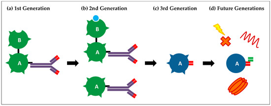 Diagram depicting the different generations of immunotoxins. (a) First-generation immunotoxins. Purified toxins were chemically linked to a targeting antibody; (b) Second-generation immunotoxins. Purified type 1 ribosome inactivating proteins (RIPs) or type 2 RIPs with B-chain either blocked or removed were chemically linked to a targeting antibody; (c) Third-generation immunotoxins. Recombinant purified toxins were fused to antibody targeting fragments; (d) Future generation immunotoxins. Toxins are modified to remove immunogenic epitopes and exhibit dual targeting abilities to improve specificity. They can be co-administered with endosome disruptive agents, such as pore-forming agents, endosome disruptive peptides, or photosensitisers, to increase intracellular delivery and potency.