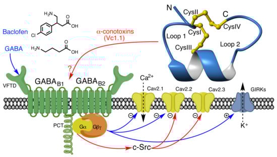 - Huynh, T.G.; Cuny, H.; Slesinger, P.A.; Adams, D.J. Novel mechanism of voltage-gated N-type (Cav2.2) calcium channel inhibition revealed through alpha-conotoxin Vc1.1 activation of the GABA(B) receptor. Mol. Pharmacol. 2015, 87, 240–250. [Google Scholar] [CrossRef] [PubMed]