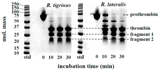 Time course of prothrombin degradation by R. tigrinus and R. lateralis venom. A mixture of human prothrombin (0.5 mg) and crude venom (5 μg) in a total volume of 110 μL 0.05 M Tris-HCl buffer, pH 7.5, containing 0.1 M NaCl was incubated at 37 °C. At the time intervals indicated, aliquots of the mixture were subjected to SDS-PAGE under unreduced conditions.