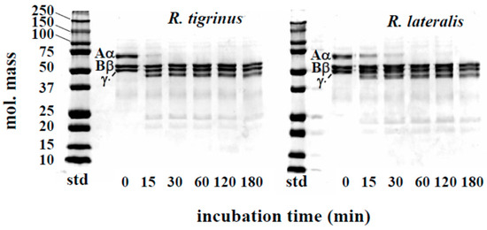 Time course of fibrinogen degradation by R. tigrinus and R. lateralis venom. A mixture of human fibrinogen (0.1 mg) and venom fraction 1 (5 μg) in a total volume of 150 μL 0.01 M Tris-HCl buffer, pH 7.5, containing 0.1 M NaCl, was incubated at 37 °C. At the time intervals indicated, aliquots of the mixture were subjected to SDS-PAGE under reduced conditions.