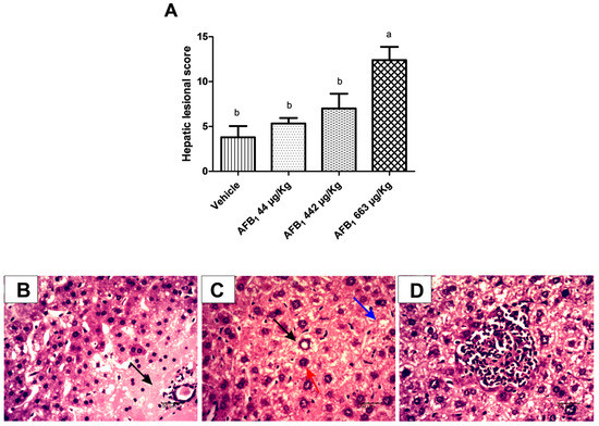 Effect of aflatoxin B1 on the livers of mice exposed to 44 μg, 442 μg, and 663 μg of AFB1/kg b.w. at 5 days after exposure. (A) Lesional score. The data are expressed as the mean ± SD, n = 5. Means without a common letter were statistically significant (p < 0.05), as demonstrated by Tukey’s test. The liver lesions observed in animals treated with AFB1 were (B) focal necrosis of hepatocytes (arrow), HE, 40×, 50 μm; (C) vacuolar hepatocyte degeneration (nuclear (black arrow) and cytoplasmic (blue arrow)) and megalocytosis (red arrow), HE, 40×, 50 μm; and (D) centrolobular inflammatory infiltrate, HE, 40×, 50 μm.