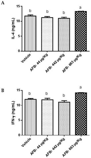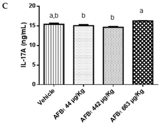 Mice treated with 663 μg of AFB1/kg b.w. showed significant upregulation of IL-4 and IFN-γ (p = 0.002) compared with the vehicle group (Figure 2). There was no difference in the IL-17 cytokine levels between animals treated with AFB1 and untreated animals (p > 0.05). In contrast, there were differences between animals treated with 44 and 442 μg of AFB1/kg of b.w. and animals treated with 663 μg of AFB1/kg of b.w. (p < 0.05).