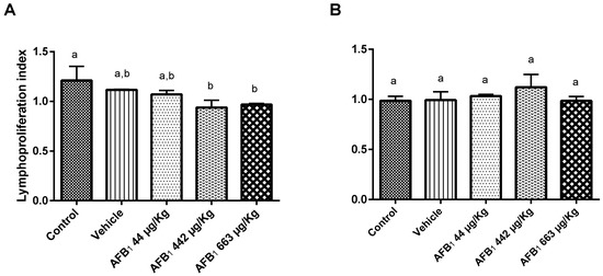 Effects of aflatoxin B1 on mouse splenocyte proliferative responses in the presence of (A) concanavalin A or (B) lipopolysaccharide 5 days after aflatoxin treatment. Significance levels were determined based on the comparison of experimental animal data with control animal data. The data are expressed as the mean ± standard deviation (SD) of the proliferative index (optical density (OD) of the test well/OD of control well) for five animals. a,b columns with different superscript letters were statistically significant (p < 0.05), as determined by Tukey’s test.