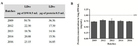 Comparative analysis of T. serrulatus batches for LD50 and protein concentration. (A) LD50 results according to DW and protein content of venom batches; and (B) total protein concentration into 1 mg DW/mL measured by BCA method. Three different dilutions of each batch were tested for protein quantification. Results are expressed as mean ± standard deviation, n = 3. DW: venom dry weight content. The dotted line indicates DW as a reference.