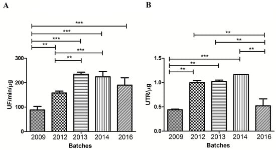 The second class of enzymatic components studied in this work as a possible marker of quality control was hyaluronidases. Venom hyaluronidases were reported as important enzymatic components present in many scorpion species [,,] and are also well-characterized components of Tityus serrulatus venom [,]. Originally termed as “spreading factors”, venom hyaluronidases are known to increase the permeability of toxins into tissues [,]. Although hyaluronidases are considered non-toxic by themselves, these molecules contribute to local and systemic envenomation []. In the present work, batch #2009 showed a relevant low hyaluronidase activity when compared to three other batches studied (batches #2012, #2013, and #2014), but not in comparison to batch #2016. Thus, the results concerning the hyaluronidase activity were not statistically significant, probably due to the number of venom batches used.