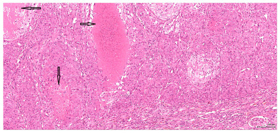 H&E: Male (case 1): epithelioid morphology, very focal clear cytoplasm, comedo-like tumour necrosis (arrows), pushing-type invasion front.