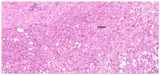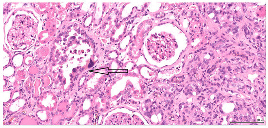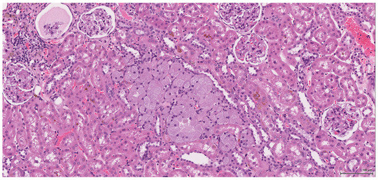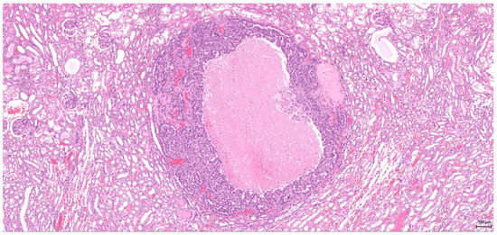 The renal lesional background is represented in most cases by different stages of chronic progressive nephropathy including degenerative and regenerative aspects: vacuolar cytoplasmic degeneration; cortical subcapsular foci of small basophilic tubuli, some of them with thickened basement membrane; compensatory enlarged hypertrophic tubuli; cystically dilated tubuli or glomeruli with glomerular metaplasia of the parietal Bowman’s capsule (typically appears in rat females after administration of androgenic compounds); casts, both hyaline and granular; variably sized cysts located within the medulla and lined by an attenuated epithelium (toxic effect or ageing related). Along with these features, regenerative tubule hyperplasia and even oncocytic hyperplasia (Figure 11) were identified in two cases. Extensive tubule necrosis is seen in one case and moderate chronic inflammatory infiltrate in another; minimal papillary urothelial hyperplasia is associated in one case.