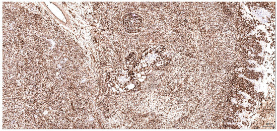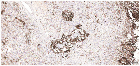 The following antibodies were used: CK AE1/AE3, clone AE1/AE3 (Dako); CK MNF 116, clone MNF 116 (Dako); CK HMW, clone 34 βE12 (Dako, Novocastra); CK7, clone OV-TL 12/30 (Dako); CK20, clone Ks 20.8 (Dako); p63, clone DAK-p63 (Dako); Vim, clone V9 (Dako, Novocastra); CD10, clone 56C6 (Dako); Desmin, clone D33 (Dako); Smooth Muscle Actin, clone 1A4 (Dako); TTF-1, clone SPT24 (Novocastra), and; S100, polyclonal (Dako, Novocastra). The antibody titer varies depending on the commercial form used: fixed/prediluted (the so-called ready-to-use variant), respectively, the optimal dilution of the concentrated form, individually adjusted according to the internal protocol of each laboratory. For S100, CD10, Vimentin and some cytokeratins (CKs), the immune reactions were repeated in all three locations by different methods with the same results. The rationale of using the above listed markers is explained in the discussion chapter under the renal cell origin section. Some of these antibodies have been applied selectively on a few cases only, where differential diagnosis was considered (e.g., TTF-1, Desmin and SMA, see Table 1). From the multitude of markers used in this study, only those including a confident internal control within the section (see Figure 6) have been listed; the others, for example, HMB45 or Melan A (both negative in case 6), have been discharged from the list.