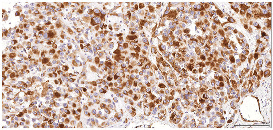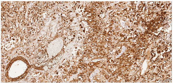 The brown immune reaction product of DAB chromogen is cytoplasmic and/or membranar for most of the listed antibodies, nuclear for p63 and TTF-1, and cytoplasmic and nuclear for S100. The immunoreactivity was evaluated by a percentage of positive tumour cells as diffuse for ≥50% and focal for <50%; the intensity of reaction was appreciated as weak or intense compared to control.