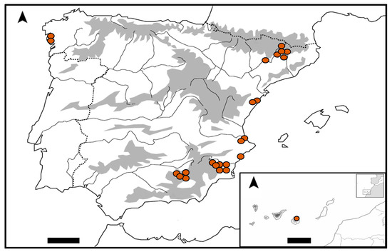 Map of the study area with sampled localities. Grey areas indicate mountain systems whose altitude is higher than 1500 m above sea level (asl). The insert represents the Canary Islands. Scale bars represent 100 km.