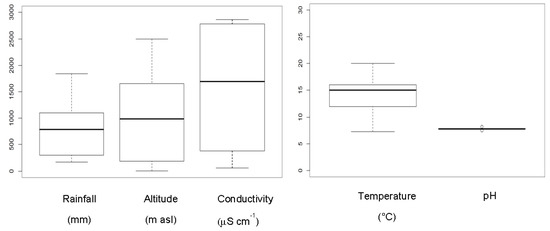 Most areas were granitic, but others were calcareous. Most of the samples contained freshwater, but some had saline water. The range of altitudes varied from 5 m to 2500 m above sea level. Rainfall ranged between <200 mm and 1843 mm. The mean air temperature was between 5 and 22.5 °C. Conductivity varied between 61.6 and 2850 μScm−1, with pH between 7 and 8.5 (Figure 3).