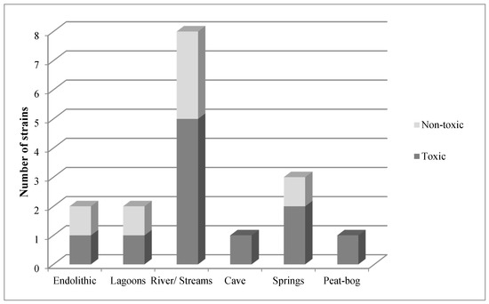 The ability to synthesise microcystins appeared very early in the evolution of cyanobacteria [39], but has been lost in certain phylogenetic branches over time. Most toxin screening efforts have been made in freshwater aquatic habitats, mainly lagoons and reservoirs. Running water, salt water, high mountains, peat bogs and aerophytic habitats (except for lichens) have been very rarely sampled [9,40].
