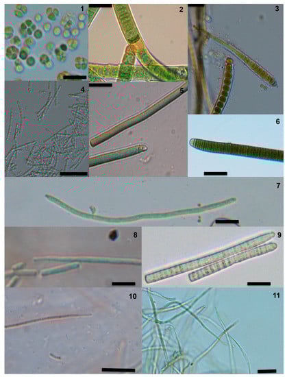 Images of the toxic strains that were isolated during this study: 1. Pseudocapsa dubia. 2. Scytonema drilosiphon. 3. Gloeotrichia natans. 4. Pseudanabaena frigida. 5. Phormidium uncinatum. 6. Oscillatoria margaritifera. 7. Phormidium sp. 8. Geitlerinema splendidum. 9. Phormidium favosum. 10. Geitlerinema carotinum. 11. Leptolyngbya rivularianum. The scale bar represents 20 μm.