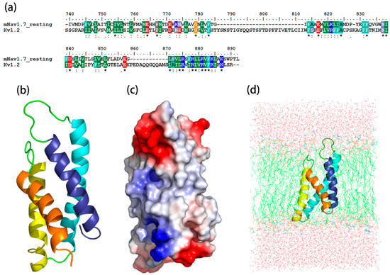 Construction and optimization of the mNav1.7_resting site 4 structure. (a) Sequence alignment between mNav1.7_resting and the Kv1.2_resting; (b) The side view of optimized structure by MD simulation; (c) A surface potential diagram of optimized structure; (d) The optimized structure in the 1-palmitoyl-2-oleoyl-sn-glycero-3-phosphocholine (POPC) membrane.