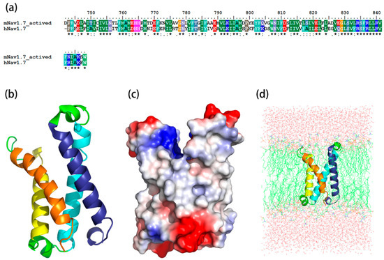 Construction and optimizing of the mNav1.7_activated site4 structure. (a) Sequence alignment between the mNav1.7_activated site 4 and the hNav1.7 (PDB ID: 5X0M); (b) The side view of optimized structure by MD simulation; (c) A surface potential diagram of optimized structure; (d) The optimized structure in the POPC membrane.