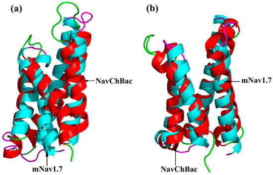 Structure superimposition of mNav1.7 and NaChBac. (a) Superimposition of the resting state; (b) Superimposition of activated state; mNav1.7 in red with green, NaChBac in blue with pink.