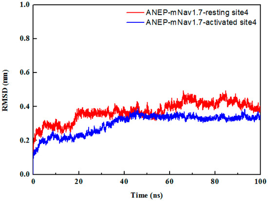 Root mean square deviation (RMSD) of the backbone Cα atoms of the mNav1.7-anti-neuroexcitation peptide (ANEP) complexes of resting and activated states in the 100 ns MD simulation.