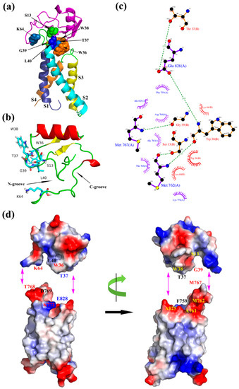 By analyzing the binding mode of the resting state (Figure 5), NC-groove was proposed to insert into the wedge space formed by S1–S2 and S3–S4 loop of domain II in mNav1.7, and the close combination of both motifs depended mainly on hydrophobic association and electrostatic interaction. Ser13 at the N-terminus, Lys64 at the C-terminus and the hydrophobic residues Thr37, Trp36, Gly39, and Leu40 of the loop, which connects β2- and β3-strands of ANEP were interacted with S1–S2 loop (K64/T768, W36/K772, L40/D769, S13/A761, S13/M762, G19/M767, T37/F759), whereas Thr37 and Trp38 in β2–β3 loop bound to S3–S4 loop (T37/E828, W38/A825) of receptor site 4, indicating that these amino acids might be essential to the recognition, and thus played important role in and the specificity of the mNav1.7 site4.