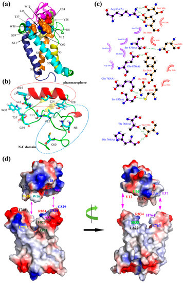 For the activated binding mode (Figure 6), the key amino acid residues Leu15, Trp16, Glu24, and Tyr28 forming the ‘pharmacophore’ were involved in binding with the S3–S4 loop of mNav1.7 site4 (L15/L822, W16/F823, W16/E821, E24/R834, Y28/E828, Y28/G829) mainly due to hydrophobic association and electrostatic interaction. Also, Asn8 and Cys60 in NC domain, and Val12, Ser13, Trp38, Thr37, and Gly39 in N-groove, primarily bound to S3–S4 loop (N8/S831, C60/S835, V12/R834, S13/R834) and secondarily to the loop of S1–S2 (T37/T768, T37/H764, W38/L775, G39/E763). Val12, Ser13 in the ‘N-groove’ and Glu24 in the ‘pharmacophore’ bound to Arg834 in the mNav1.7 via electrostatic interactions and ionic bond action, respectively. These results were compatible with the study on the interaction between rNav1.2/rNav1.6 and Css4/Cn2 [19,20,21], and were in agreement with previous reports that the ‘pharmacophore’ (E24 and Y28) and N-groove of the scorpion depressant toxin made major contributions to promoting VSD trapping [22]. From the two binding modes, we conjectured that the loop connecting β2- and β3-strands in N-groove, and NC domain played a dual role in receptor site recognition and mode of action.