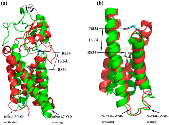 Superimposition of Nav-resting and Nav-activated model. (a) Docking model of mNav1.7 site 4 and ANEP; (b) Model of NaChBac-VSD. Nav-resting in green, Nav-activated in red.