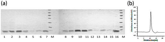 (a) 15% SDS-PAGE of the purified mutant proteins. Lane 1, 8, 12: rANEP; Lane 2–7, 9–16: mutants of N8A, V12A, S13A, L15A, W16A, E24A, Y28A, W36A, T37A, W38A, T39A, L40A, C60A, K64⊿; Lane M: Protein Maker; (b) RP-HPLC of mutant proteins on an RPC C2/C18 ST column.
